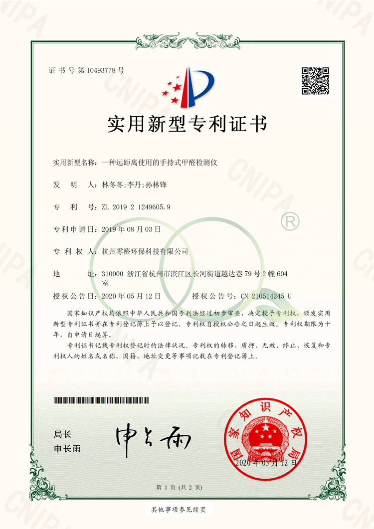 專利證書:一種遠距離使用的手持式甲醛檢測儀