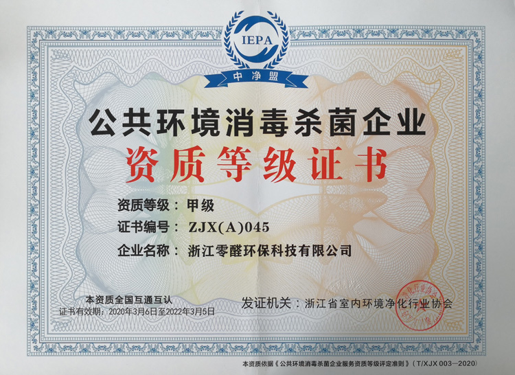 公共環境消毒殺菌企業資質等級證書