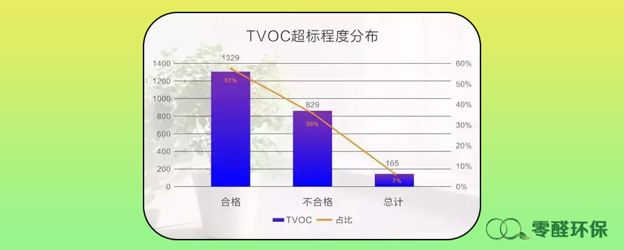 TVOC超標2倍以下的點位占比57%,超標2-3倍點位占比36%,超標3倍以上點位占比7%,其中最高超標記錄為超過國家標準21倍。